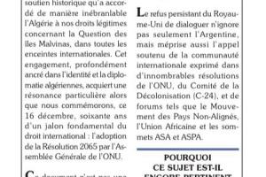 En este camino de reclamo permanente, basado en la razón y la diplomacia, los argentinos tenemos un aliado valioso: la República Argelina Democrática y Popular, un líder indiscutido en la causa global de la descolonización.